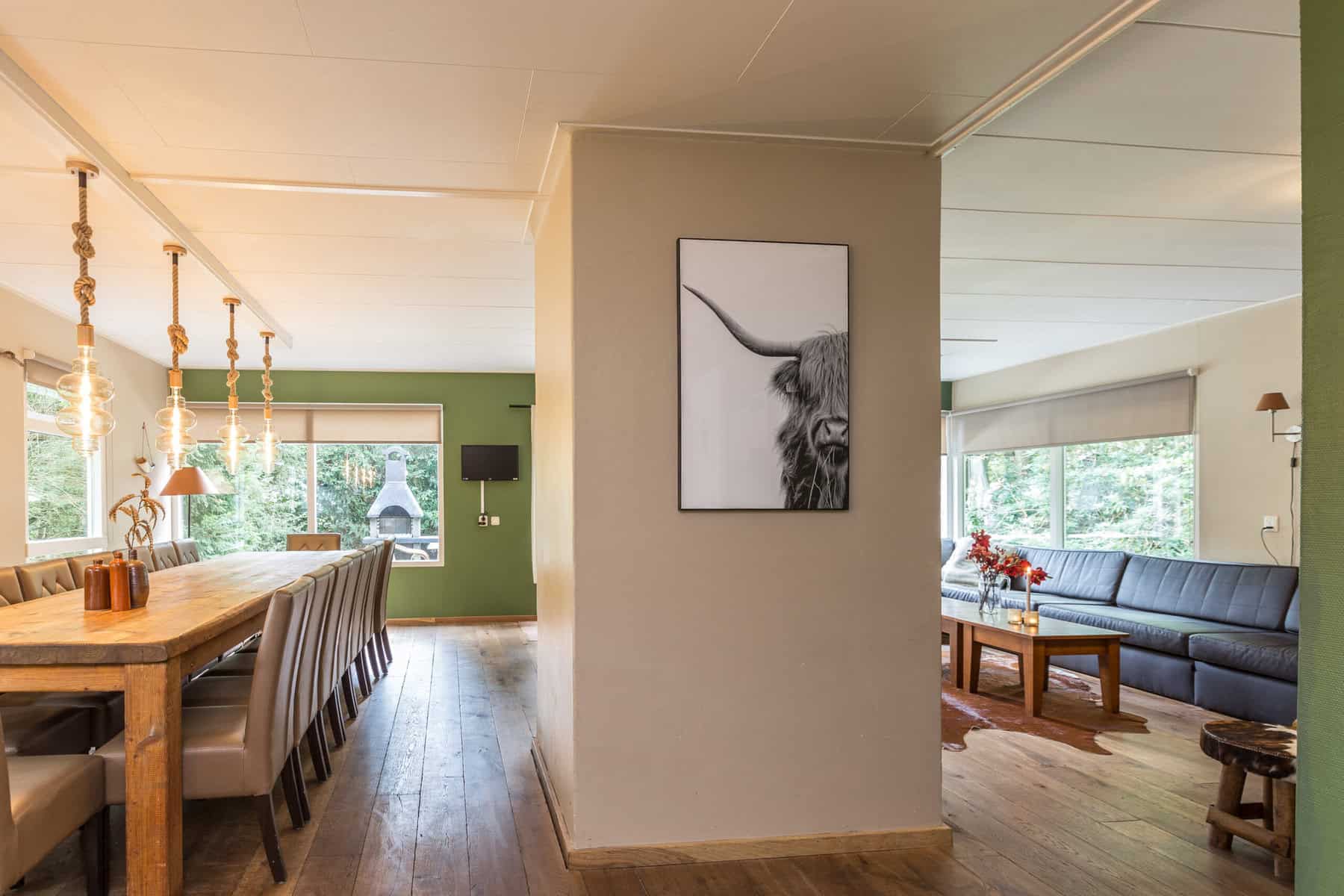 Deze ruime accommodatie ademt een landelijke en gezellige sfeer. De royale living beschikt over een openhaard, comfortabele zithoek en een compleet ingerichte open keuken met een gezellig barretje en een lange Franse wijntafel, ideaal om samen te koken en te genieten van diners met je groep.