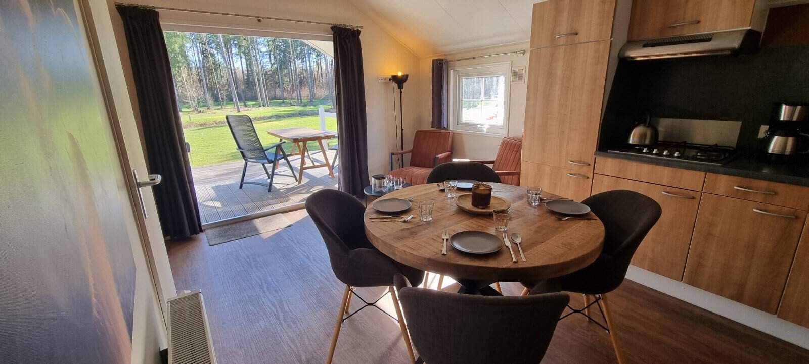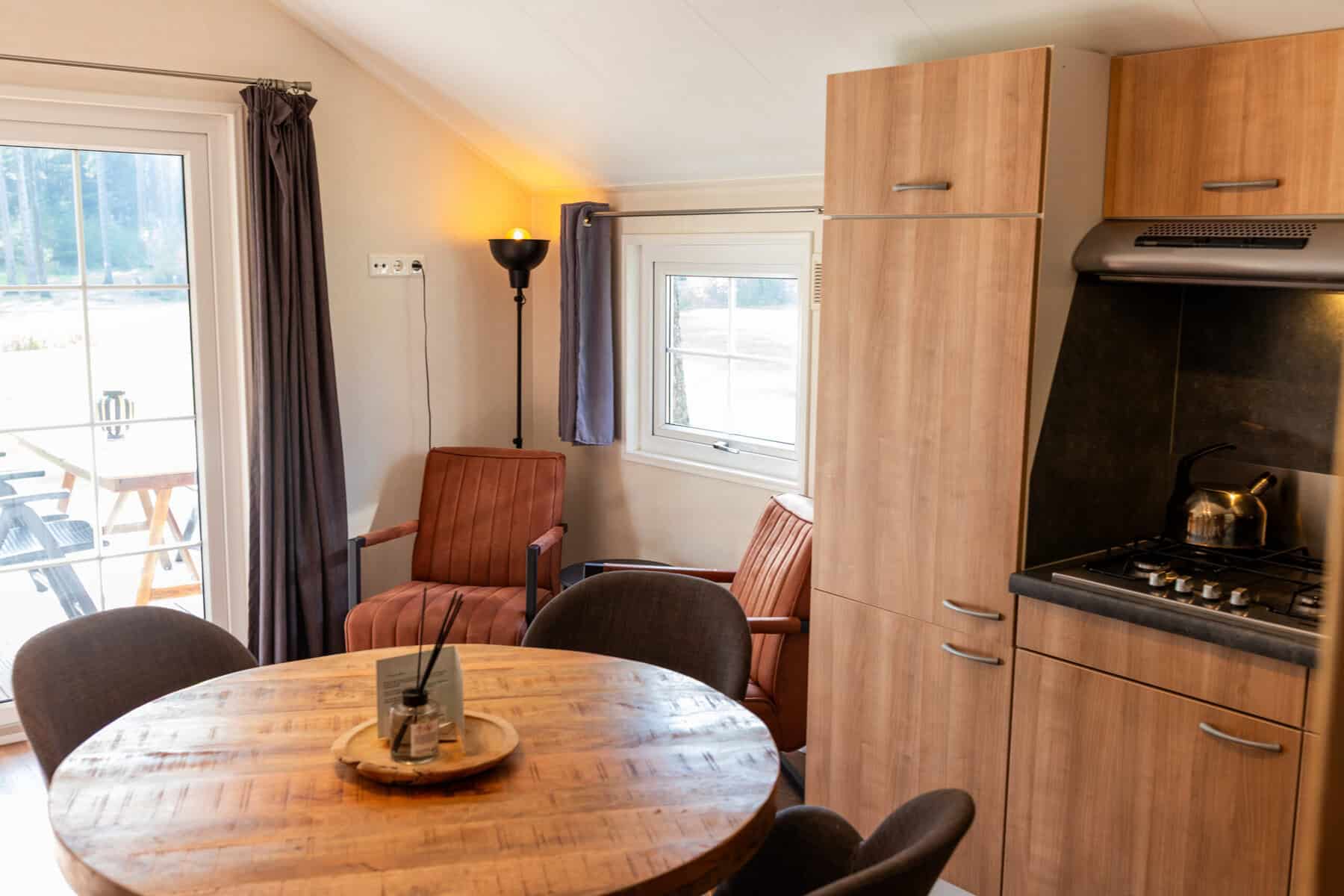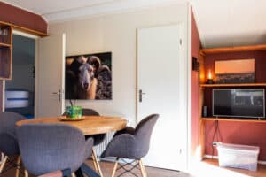 Deze chalet heeft een oppervlakte van 24m2 die een charmante sfeer uitstraalt. Met openslaande deuren en een heerlijk terras kun je vanaf de picknicktafel of liggend in de hangmat genieten van het prachtige uitzicht van het Nationaal Park Dwingelderveld.