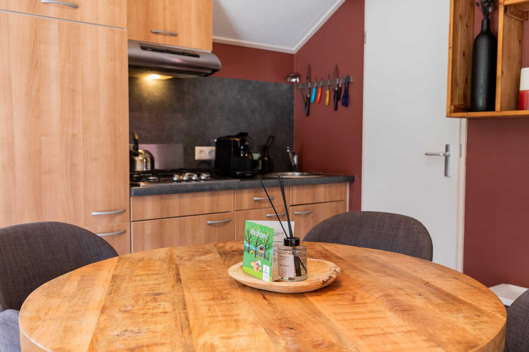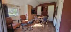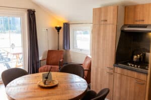 Compleet ingericht met tv, keuken met koelkast en inventaris, eetkamer, 2 fauteuils en een badkamer. De Mini-Chalet bestaat uit 2 slaapkamers; 1 slaapkamer met 2 enkele bedden en een slaapkamer met een stapelbed.